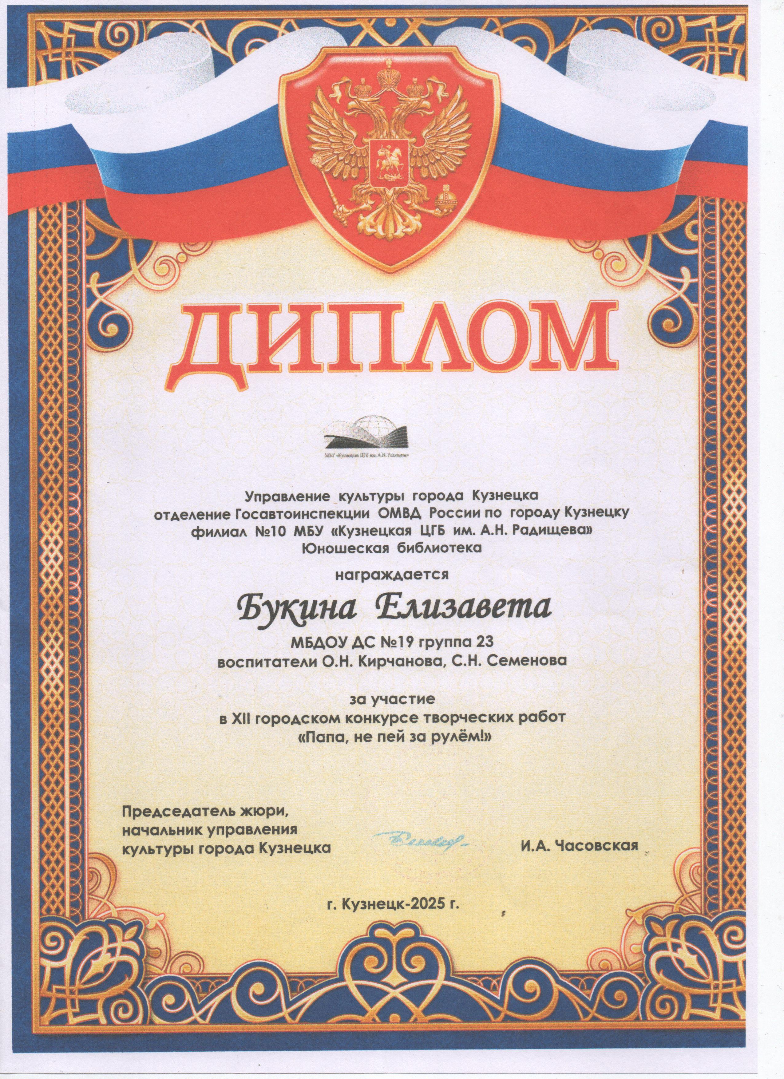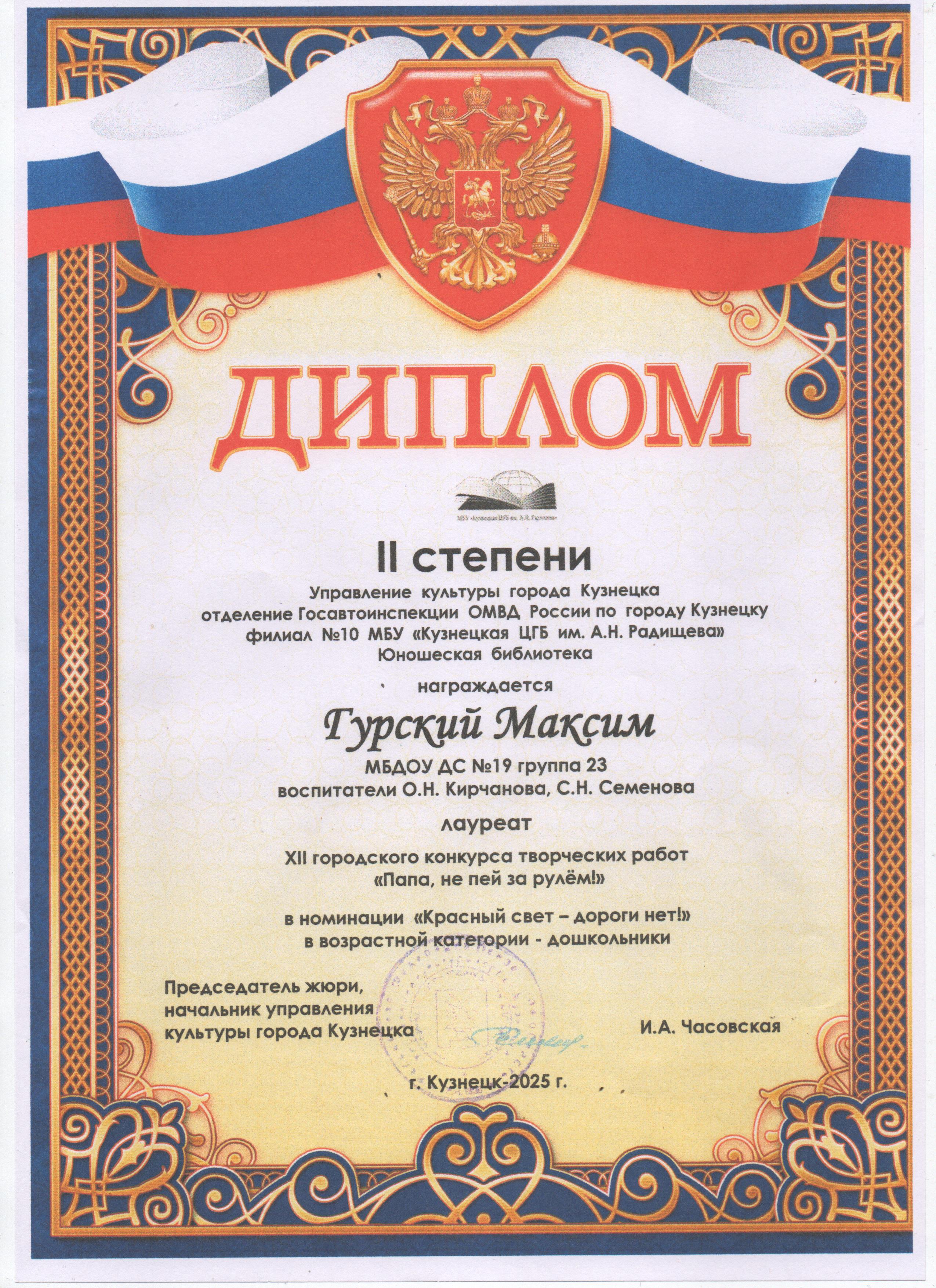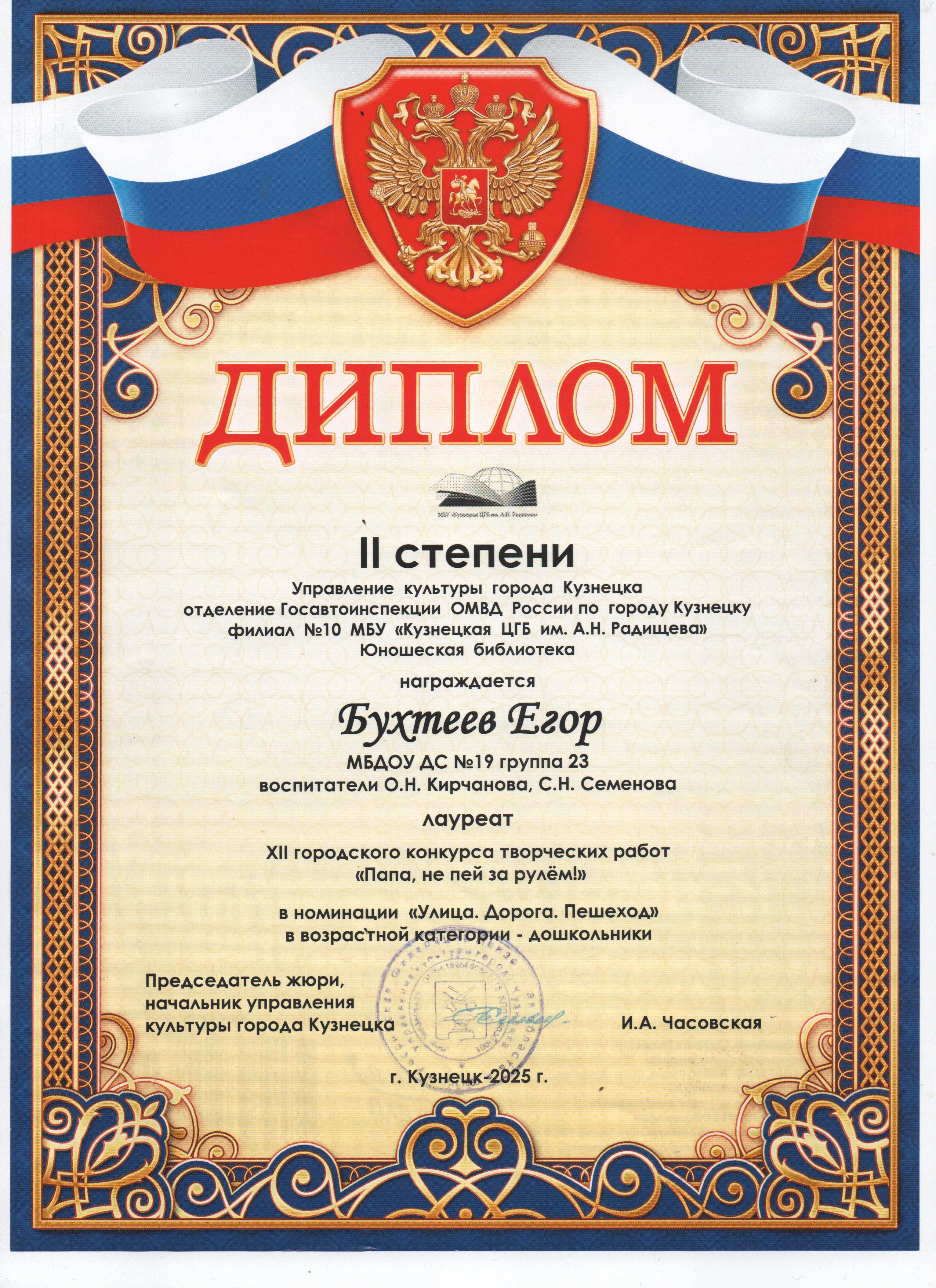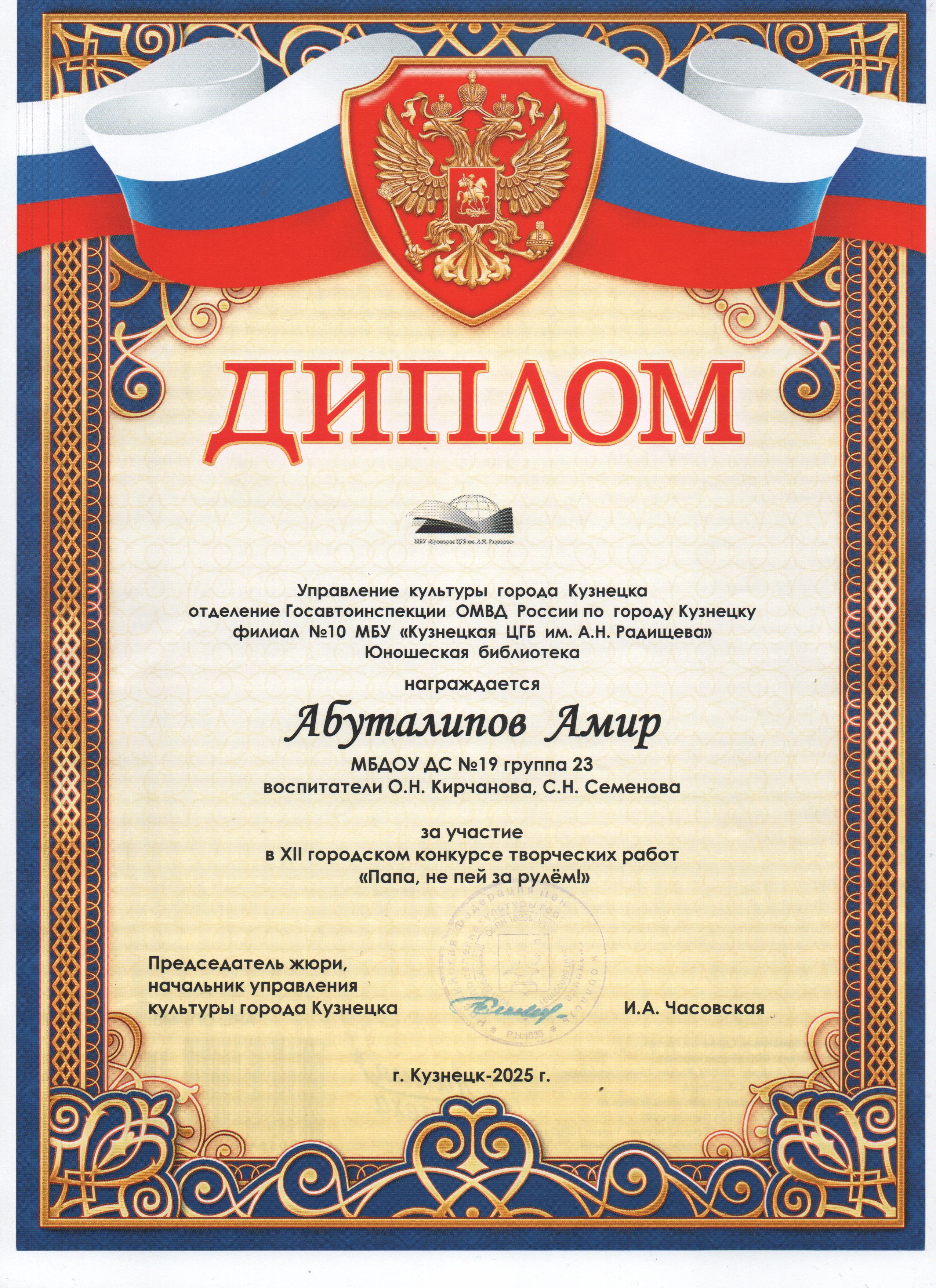 Дипломы за участие в XII городском конкурсе творческих работ "Папа, не пей за рулем!" (2 место, участие воспитанники)